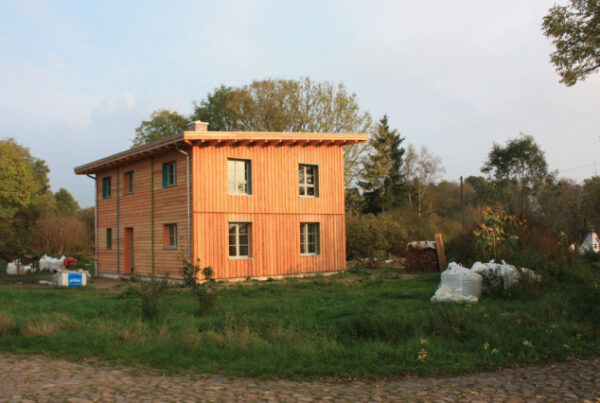 Bauweise: Gründung: Stahlbetonstreifenfundamente Fußbodenaufbau EG: Kiesschicht, Schaumglasschotter, Estrich, Dielung Decke über EG: Balkendecke Wandaufbau: Kleinballen hochkant, Lehmputz innen, Kalkputz außen