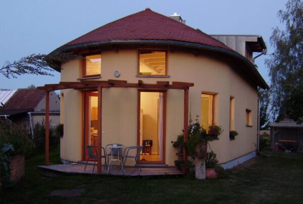 Gründung: Stahlbetonstreifenfundamente Fußbodenaufbau EG: Kiesschicht, Schaumglasschotter, Estrich, Dielung Decke über EG und 1. + 2.OG: Balkendecke Wandaufbau: Kleinballen hochkant, Lehmputz innen, Kalkputz außen